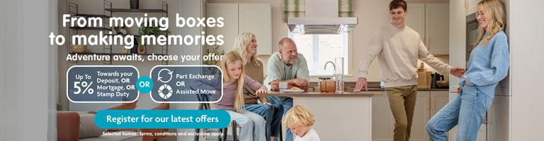 Adventure awaits in your brand-new home! At Miller Homes, we’re here to turn your ‘one day’ dreams into ‘right now’ reality. On selected homes you can choose from up to 5% towards your mortgage, deposit, or Stamp Duty*, or benefit from our Part Exchange† and Assisted Move^ options, meaning your new adventure is closer than you think. So, get moving. Pre-reserve your new home online today. Terms and conditions apply.